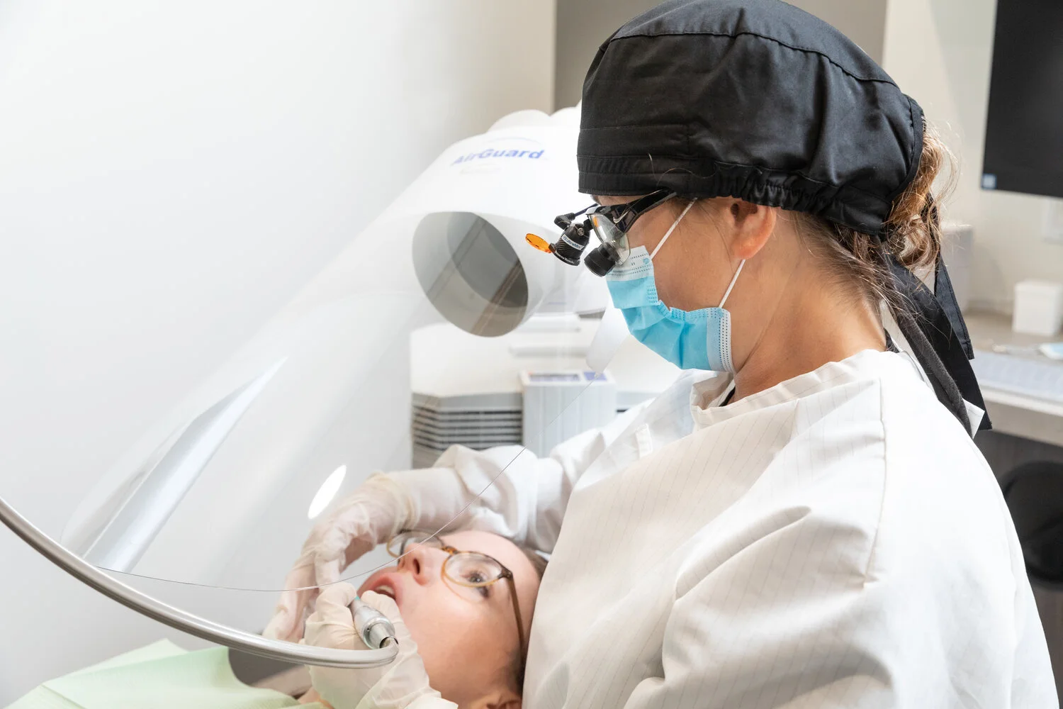 AirGuard™ is a vacuum accessory that blocks aerosol sprays that come from patients’ mouths with a transparent shield. Then, it immediately sucks the spray away using your dental vacuum. AirGuard™ is designed to provide enhanced protection from viruses, infections, and general splashback that spread via the air, such as COVID-19, cold, and flu germs, while also allowing dentists full access to patients without obscuring their visibility or ability to complete dental work. There are three AirGuard™ models ranging from a standard protective shield for existing dental vacuum units to a more advanced model with built-in screen, high-definition camera, precision lighting system, and other features.